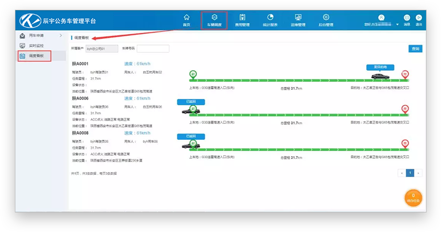调度看板将车辆行驶状态一一呈现,将车管的工作简单化